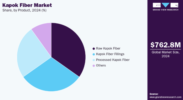 2024年には生カポック繊維セグメントが市場を支配し、収益シェア34.8%を占めました。これは農業研究による栽培規模拡大と収穫技術向上の取り組みが牽引したものです。生繊維の天然の浮力性、耐水性、断熱性は、繊維充填材から断熱材まで多様な産業用途を支えています。持続可能な農業と作物の多様化生産を促進する政府支援政策が、供給基盤をさらに強化しています。