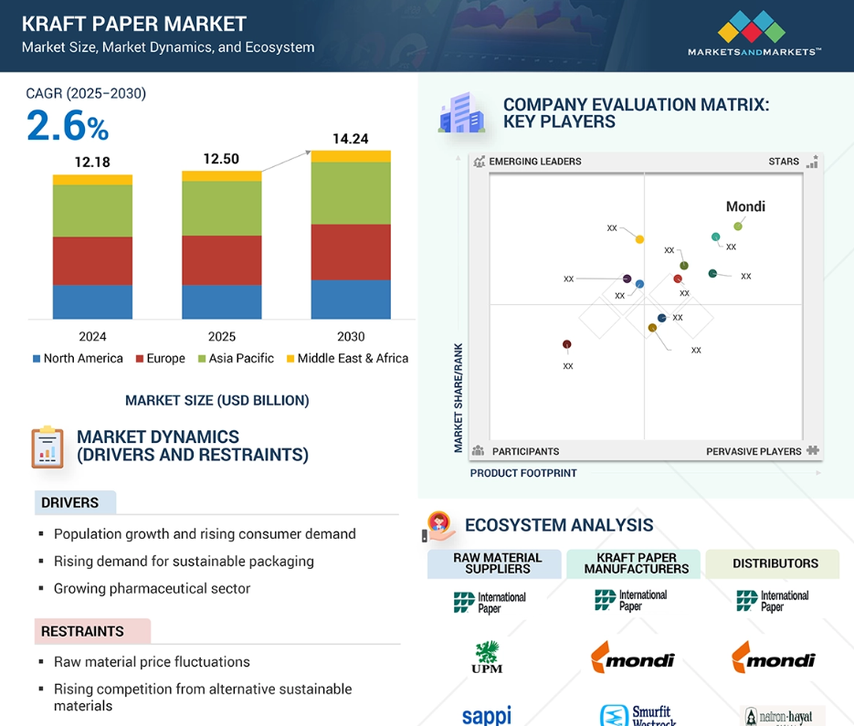 クラフト紙市場は、大手企業、地域メーカー、多数の小規模生産者が混在する高度に分断された構造となっています。モンディやスマーフィット・ウェストロックといった国際的な大手企業は、規模の経済、最新技術、広範なグローバル流通ネットワークを活用し、運営コストを削減して高い利益率を実現しています。一方、中小メーカーは高い生産コストの維持に苦慮し、市場での影響力も限定的です。地域・ローカル企業は、手頃な価格とカスタマイズされたサービスでニッチ市場に参入し、顧客獲得のために価格を引き下げるケースが頻繁に見られます。大半のメーカーは同等グレードのクラフト紙を生産するため、製品差別化が困難であり、結果として価格が重要な競争要素となります。この価格競争への過度な依存は、既存企業と新規参入企業の双方にとって収益性を損なう可能性があります。インドや東南アジアのような急成長市場では、小規模製紙工場が特に価格に敏感であり、電子商取引や地域向けケータリングといった急成長分野での受注獲得に熱心です。さらに、特にアジアにおける安価なクラフト紙の流入は、北米やヨーロッパといった成熟市場におけるグローバル大手企業にとって脅威となっています。革新や効率化を図らず、高付加価値・特殊クラフト紙の生産拡大に踏み切れない企業は、市場から取り残されるリスクがあります。したがって、需要が拡大し続ける一方で、クラフト紙産業は激しい競争と価格安定性の維持という長期的な課題に直面しています。