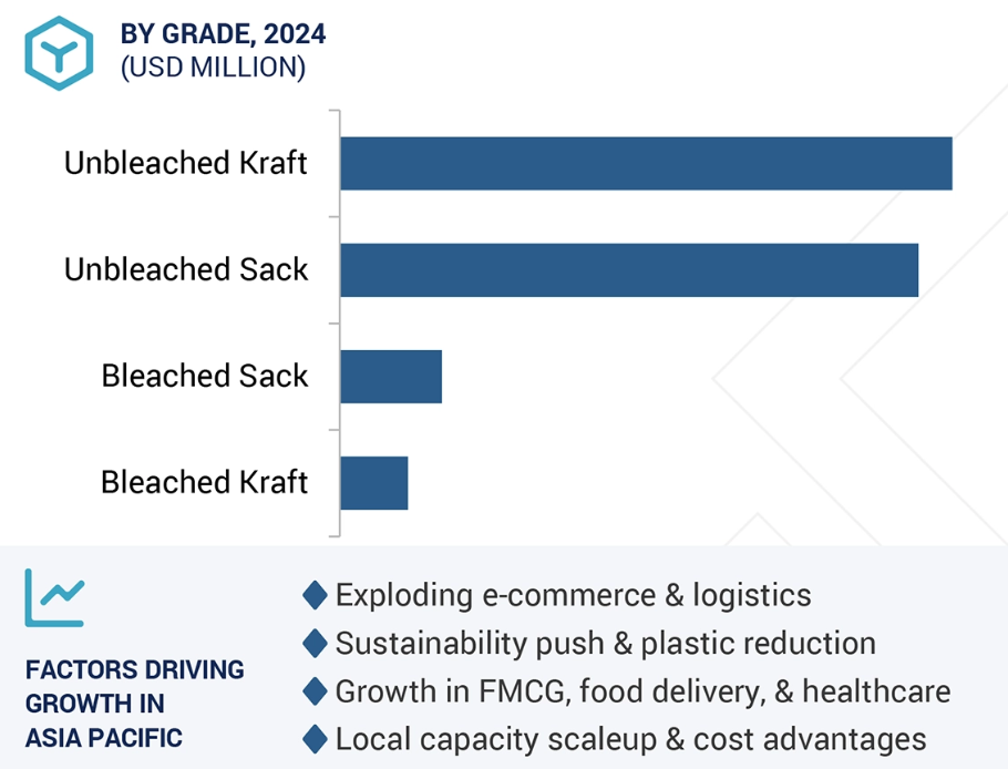 アジア太平洋地域におけるクラフト紙市場の成長は、持続可能な包装材への需要増加、電子商取引の急速な拡大、外食産業および小売活動の活発化、そして環境規制の支援策によって牽引されています。