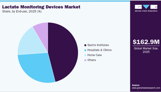 アプリケーション別では、スポーツ分野が2025年に58.98%の最大市場シェアを占めました。この成長は、運動能力とトレーニング計画の最適化ニーズに起因します。これらの装置はアスリートの乳酸レベルを測定し、運動中の代謝状態に関する貴重な知見を提供する。長距離走、水泳、サイクリングなど様々な競技のアスリートは、トレーニング計画を最適化するために乳酸レベルをモニタリングすることで恩恵を受ける。トレーニング計画には通常、持久力向上のための持続可能なペースでの長距離走と、スピードとスタミナ向上のための短距離・高速インターバル走が組み合わされる。乳酸モニタリング装置は、時間の経過に伴う乳酸閾値の変化を測定することで、アスリートの進捗状況を追跡するのに役立つ。