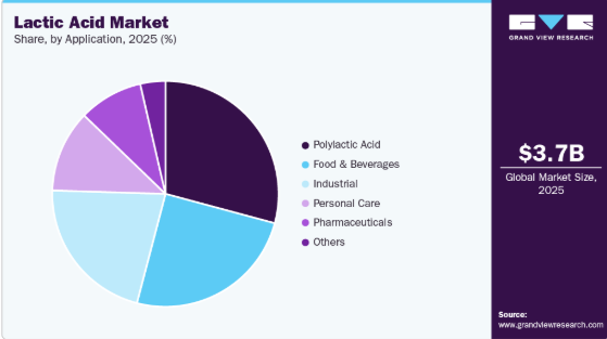ポリ乳酸(PLA)用途が市場を支配し、2025年には最大の収益シェア29.2%を占めた。これは世界的な産業が持続可能で生分解性素材への移行を加速しているためである。包装、繊維、自動車、3Dプリンティングにおける幅広い用途が安定した需要を牽引する一方、PLA生産能力への投資拡大が乳酸バリューチェーン内の主要成長エンジンとしての地位を強化している。