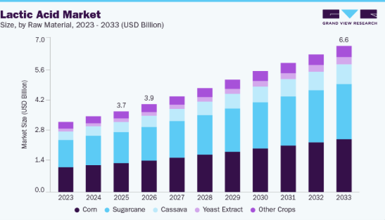 持続可能な素材への消費者および規制面での需要の高まりが、バイオプラスチック、化粧品、食品原料の主要構成要素としての乳酸の採用を加速させている。