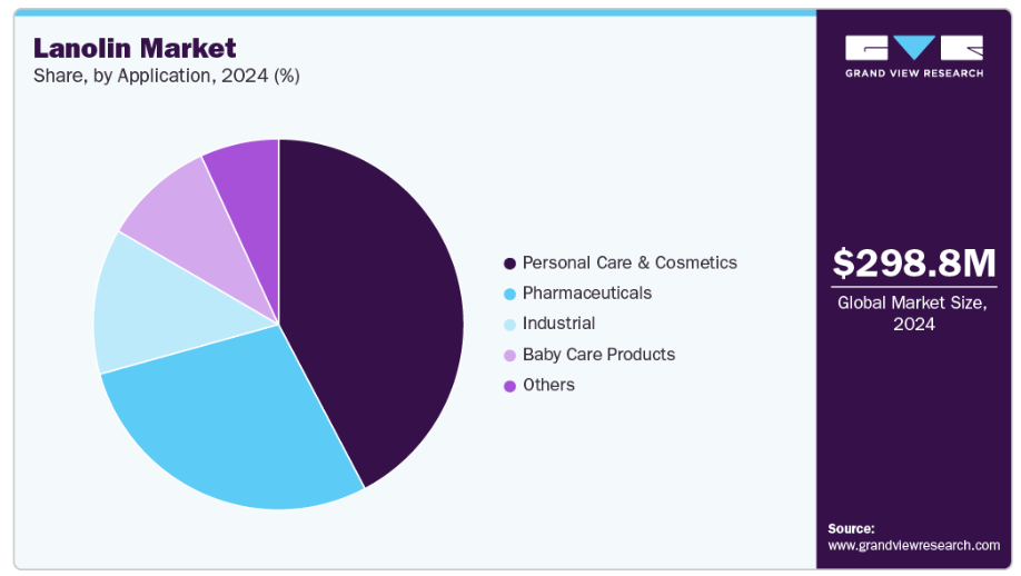 2024年、パーソナルケア・化粧品セグメントは売上高シェア42.28%で産業をリードしました。これは、ラノリンが天然保湿剤・皮膚コンディショニング剤として、クリーム、ローション、リップバーム、ヘアケア製品、ベビーケア製品に広く使用されているためです。保湿力の持続性、肌を滑らかにする効果、製品の安定性向上といった特性から、化粧品メーカーにとって好まれる原料となっております。パーソナルケア製品における天然・安全な原料への消費者嗜好の高まりが、このセグメントの優位性をさらに強化しております。