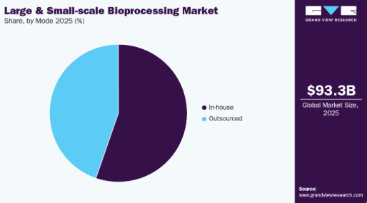 2025年には、自社内生産セグメントが最大の収益シェアで市場をリードしました。これは、自社内でのバイオ医薬品生産を遂行できる確立された国際的プレーヤーの存在によるものです。企業は自社内能力を活用し、製品開発プロセスの機密性を維持しています。さらに、自社内施設はカスタマイズされたソリューション、効率性の向上、既存システムとの優れた統合を可能にし、大規模・小規模双方のバイオプロセス操作をサポートします。