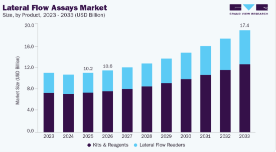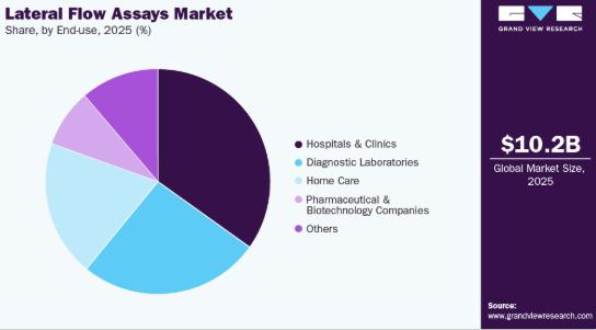 臨床検査分野は、感染症の発生率上昇、政府主導の取り組み強化、迅速診断技術の進歩を背景に著しい成長を遂げています。LFAはHIV、結核(TB)、マラリア、インフルエンザ、性感染症(STI)など感染症の早期かつ正確な検出に広く活用されています。CDCによれば、クラミジア、淋病、梅毒の総症例数は2024年に前年比9%減少し、3年連続の全体的な減少を記録した。しかし、220万件以上のSTIが確認され、これは10年前と比較して13%の増加を示す。主な傾向として、クラミジア発生件数が8%減、淋病症例が10%減、初期・二次梅毒症例が22%減となった。一方、先天性梅毒症例は急増を続け4,000件に迫り、12年連続の増加傾向と過去10年間で約700%の増加を示している。こうした疾病負担の増加は、迅速かつアクセスしやすい診断ソリューションへの需要を喚起し、LFA市場の成長をさらに促進している。