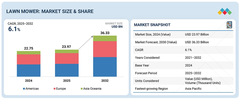 芝刈り機市場は、2025年の239億7,000万米ドルから、2032年までに年平均成長率(CAGR)6.1%で363億3,000万米ドルに達すると予測されています。芝刈り機市場は着実な成長を続けており、その主な要因はバッテリー駆動式およびロボットモデルの普及拡大にあります。この変化は、バッテリー技術の進歩、静粛性の向上、運用コストの削減によって支えられています。
