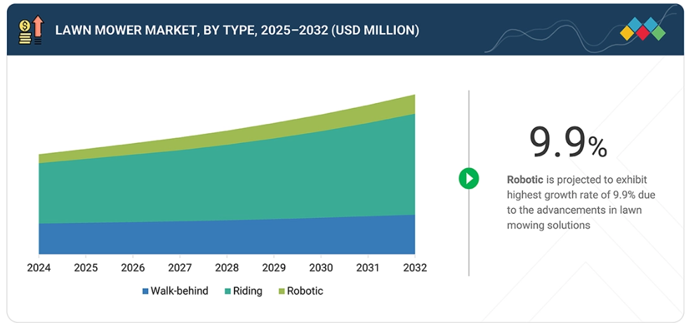 ■ 英語タイトル:Lawn Mower Market by Type (Riding, Walk-behind, Robotic), Propulsion (ICE, EV), End-user (Residential, Commercial), Autonomy (Autonomous, Non-autonomous), Lawn Size (Small, Medium, Large), Hardware, Software, and Region - Global Forecast to 2032