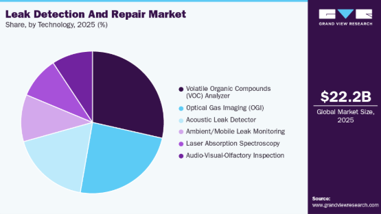 サービス分野は2025年に市場を支配し、世界収益の63.5%以上を占めました。ポンプ、バルブ、コネクター、コンプレッサーなどの漏洩設備は、化学製造施設や石油精製所における揮発性有機化合物(VOC)排出の主要な発生源です。この漏洩は作業員への脅威となり、大気汚染を引き起こします。その結果、石油会社は高コストな漏洩を最小限に抑えるためLDARサービスを要求しており、これがセグメント成長を牽引しています。