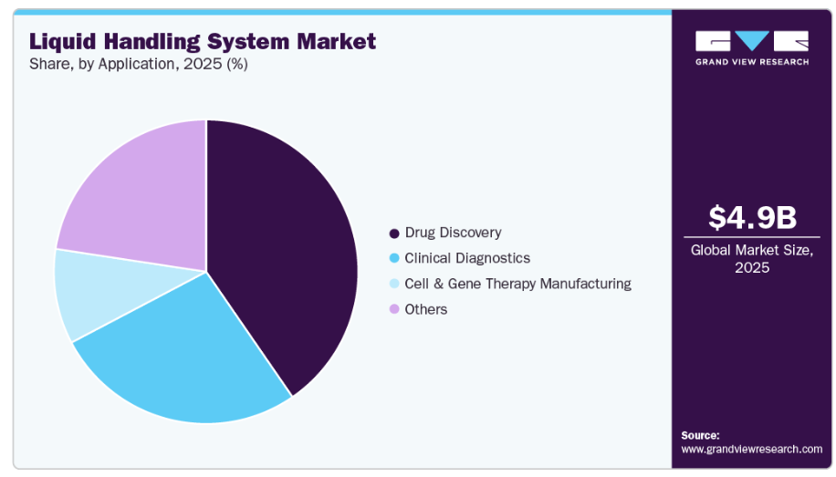 創薬セグメントは、スクリーニングやアッセイ開発における液体ハンドリングシステムの広範な利用に牽引され、2025年には40.4%という最大の収益シェアで市場をリードしました。製薬企業は、大量のサンプルを高精度で管理するために自動化プラットフォームに依存していました。より迅速なタイムラインと再現性のある結果へのニーズが、強力な導入を後押ししました。研究開発(R&D)への継続的な投資により、このアプリケーションセグメントは最前線に位置し続けました。