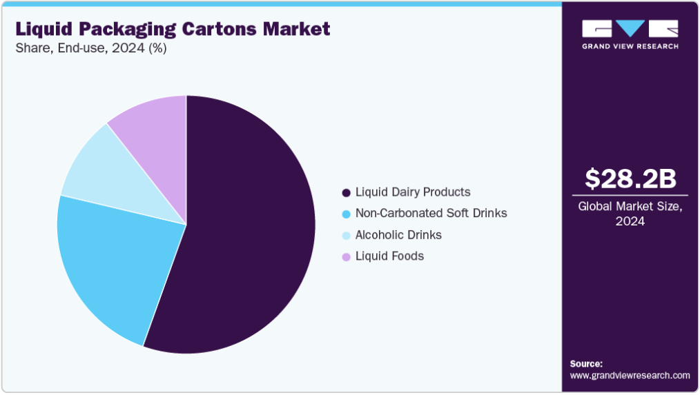 液体乳製品セグメントは2024年に55.0%超の最大市場シェアを記録しました。牛乳、フレーバーミルク、ヨーグルトドリンク、クリームなどの液体乳製品は、液体包装用カートンの主要なエンドユーザーカテゴリーです。これらの製品は通常、無菌カートンまたはゲーブルトップカートンに包装され、冷蔵不要で長期保存が可能であり、栄養成分を保持します。アムル、ラクタリス、ネスレなどの主要ブランドは、常温および冷蔵乳製品の流通においてカートン包装に大きく依存している。先進国と新興国双方における安全で保存性の高い乳製品への需要増加がこのセグメントを牽引している。