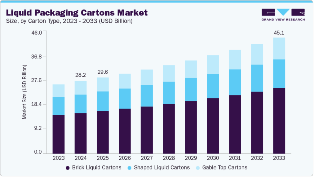 無菌包装技術の進歩と都市化の進展が市場成長をさらに促進している。消費者と規制当局の双方からプラスチック使用削減が求められており、メーカーは再生可能かつリサイクル可能な素材の採用を迫られている。液体用カートンは、バリア保護のためにポリエチレンとアルミニウムの薄い層でコーティングされた板紙で作られることが多く、プラスチックボトルやパウチに比べ環境に優しい代替品と見なされている。例えばテトラパックなどの企業は、カーボンフットプリントを削減した植物由来のカートンを導入し、グリーン包装を求める消費者の需要に応えている。この持続可能性への訴求力は、特に環境意識の高いヨーロッパなどの地域において、市場成長を推進する主要因となっている。