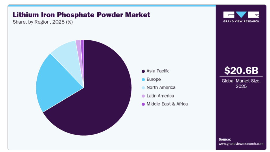 2025年には、アジア太平洋地域が市場を支配し、売上高シェアの66.4%を占めました。アジア太平洋地域は、中国の確立されたバッテリー供給チェーンのエコシステムを牽引役として、生産および消費の両面でリン酸鉄リチウム粉末産業を支配しています。Contemporary Amperex Technology Co. LimitedやBYD Company Limitedなどの主要メーカーは、国内市場および輸出市場の両方に向けて、LFPバッテリーの生産拡大を続けています。EVの普及率の高さ、政府による広範な支援、そしてコスト競争力のある製造能力により、同地域はLFP正極材生産の世界的な中心地としての地位を確立しています。さらに、中国、韓国、東南アジアにおける再生可能エネルギーの急速な普及は、定置型蓄電システムへの需要をさらに後押ししています。