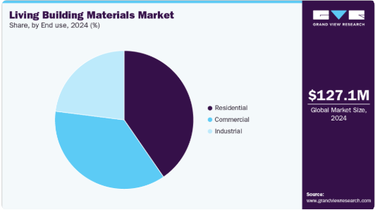 住宅セグメントは2024年に40.4%の最高収益シェアを占めました。これは持続可能な住宅が都市計画者や開発業者の主要な焦点となっているためです。消費者は、エネルギー効率の向上、空気質の改善、構造耐久性の増強を提供する環境に優しい住宅をますます選択しています。バイオベース断熱材、菌糸体パネル、自己修復コンクリートなどの生体材料が、LEEDやIGBCなどのグリーンビルディング基準を満たすため、新規住宅プロジェクトに組み込まれている。持続可能な住宅に対する政府の優遇措置と気候変動影響への意識高まりが相まって、採用はさらに加速している。中小規模の住宅設計へのこれらの材料の組み込みの容易さも、都市部と準都市部双方での広範な導入を支えている。