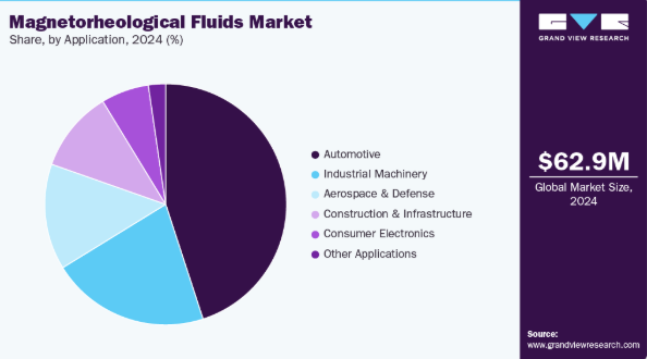 自動車セグメントは、先進的な減衰システム、適応型サスペンションシステム、MRブレーキおよびクラッチにおける磁気レオロジー流体の普及を背景に、2024年に45.0%という最大の収益シェアで市場を支配しました。高性能車・電気自動車・自動運転車への需要拡大に伴い、OEMメーカーが精密な振動制御、乗り心地向上、安全性が極めて重要なブレーキソリューションを追求する中で、MR流体ベース技術の統合が加速している。自動車メーカーはスマートサスペンションやアクティブ制御システムの研究開発への投資を拡大しており、同セグメントの主導的地位をさらに強化している。自動車生産台数の増加、安全基準の厳格化、プレミアム車・電気自動車への移行が相まって、自動車用途におけるMR流体の持続的な収益成長と市場支配が保証されている。