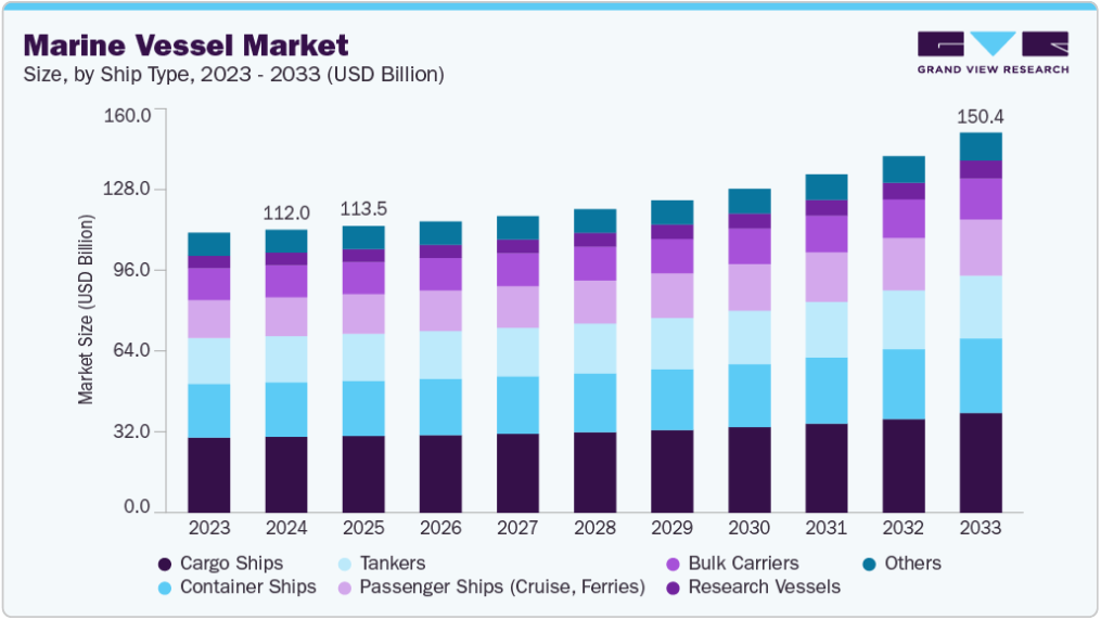 本レポートは、2021年から2033年までの各サブセグメントにおける最新の業界動向分析を提供するとともに、世界・地域・国レベルでの収益成長を予測します。グランドビューリサーチは、船舶タイプ、載貨重量トン数、運用形態、地域に基づいて世界の船舶市場レポートをセグメント化しました。