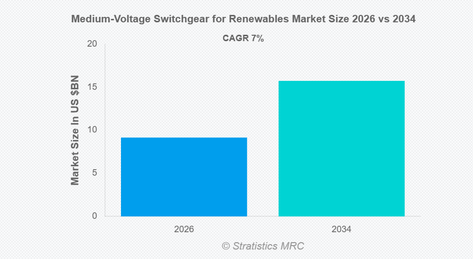 Stratistics MRCによると、再生可能エネルギー向け中電圧開閉装置の世界市場規模は2026年に91億5,000万ドルに達し、予測期間中に年平均成長率(CAGR)7.0%で拡大し、2034年までに157億3,000万ドルに達すると見込まれています。