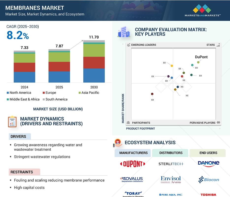 世界のメンブレン市場は、2025年の78億7,000万米ドルから2030年までに117億米ドルに達すると予測されており、予測期間中は年平均成長率(CAGR)8.2%で成長する見込みです。