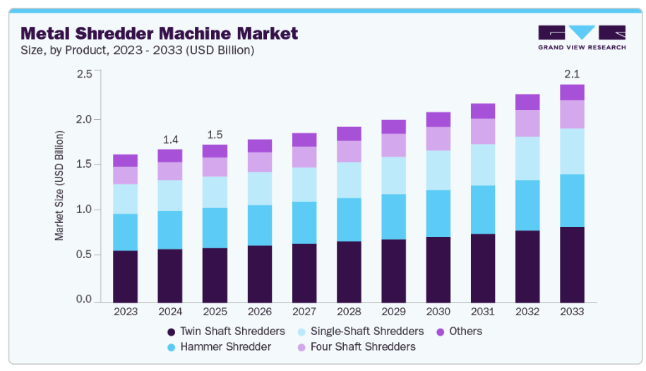 効率的な廃棄物管理システムへの需要急増により、各産業は近代的な金属シュレッディング技術への投資を推進しています。シュレッダーは費用対効果の高い材料回収を可能にし、企業の業務最適化と廃棄費用削減に貢献します。省エネ駆動装置、スマート監視システム、耐摩耗部品などの技術進歩が機械性能を向上させています。電子廃棄物リサイクルの拡大と持続可能な生産手法も市場成長を加速させています。