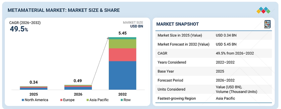 メタマテリアル市場は、予測期間中に年平均成長率(CAGR)49.5%で成長し、2026年の4億9000万米ドルから2032年には54億5000万米ドルに達すると予測されています。