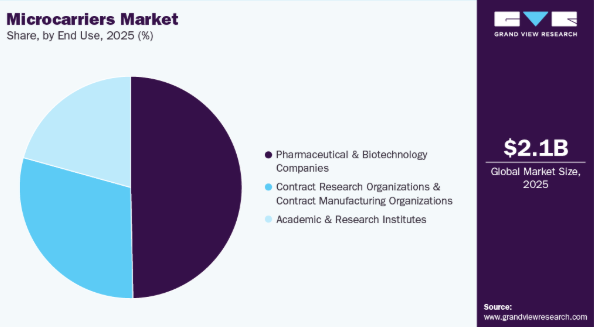 2025年には、製薬・バイオテクノロジー企業セグメントが49.69%という最大の収益シェアで市場をリードしました。マイクロキャリア産業は、主にモノクローナル抗体、細胞ベースワクチン、遺伝子治療を含むバイオロジクスの拡張性と効率性を兼ね備えた生産需要の高まりにより、製薬・バイオテクノロジー企業向けの複数の主要要因によって牽引されている。これらの企業が大規模バイオ製造のための細胞培養システムへの投資を拡大するにつれ、マイクロキャリアは付着細胞の増殖に不可欠となり、バイオリアクター内での高密度培養を支える費用対効果の高いソリューションを提供している。