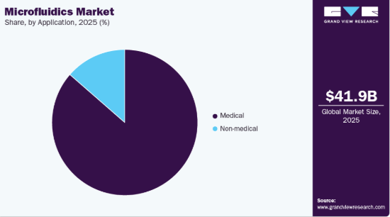 マイクロ流体コンポーネントセグメントは2025年に最大の収益シェアを占め、予測期間中に最も高いCAGRを記録すると予想される。この需要増加は、ポンプ、バルブ、チップ、センサーなどのコンポーネントが、診断、薬物送達、ラボオンチップアプリケーションなどにおける正確な流体制御に不可欠な役割を果たしていることに起因する。