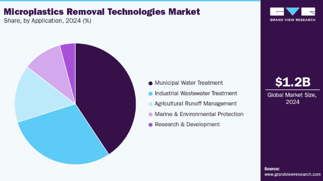 2024年時点で、自治体水処理セグメントが40.68%の最大の収益シェアで市場をリードした。都市水処理では、公衆衛生の安全確保のため、飲料水および廃水からマイクロプラスチックを除去する。都市化の進展とプラスチック材料の使用増加に伴い、世界的に飲料水システムからマイクロプラスチックが検出されるケースが増加している。主な推進要因には、水質に関する厳格な規制枠組み(WHOガイドラインやEU水枠組み指令など)、マイクロプラスチック汚染に対する一般市民の意識の高まり、安全な飲料水基準の維持の必要性などが挙げられる。