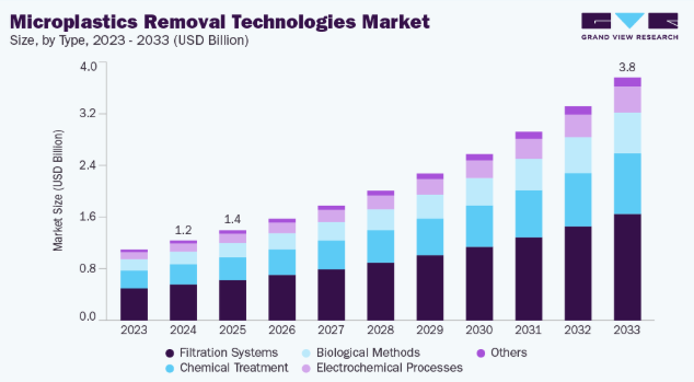 マイクロプラスチック除去技術は、高い資本コスト、エネルギー集約的なプロセス、拡張性の制限といった課題に直面している。例えば膜技術はマイクロプラスチックを効果的に捕捉できるが、多大な維持管理と投資を必要とする。しかし、公衆の関心、規制、企業の持続可能性への取り組みが高まるにつれ、採用は拡大すると予想される。したがって、この業界は長期的な成長可能性を示しているが、技術の成熟とコスト削減に大きく依存している。