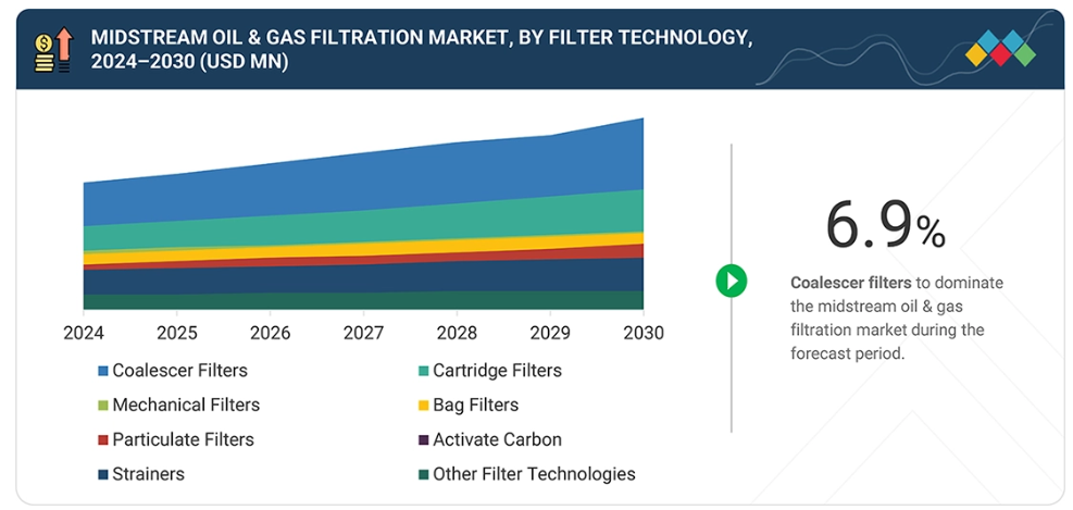 中流石油・ガスプロセスは、メディアおよび機器サプライヤーを含む高度なろ過システムに依存しています。これらのサプライヤーは、システムインテグレーターやOEM向けに、先進的なフィルターエレメント、ハウジング、分離技術を提供します。これらの企業は、地上での流れ、処理、輸送のための高品質なろ過ソリューションを設計・提供します。ろ過ソリューションが開発されると、仲介業者やサービス会社がOEMとオペレーターの連携を促進します。