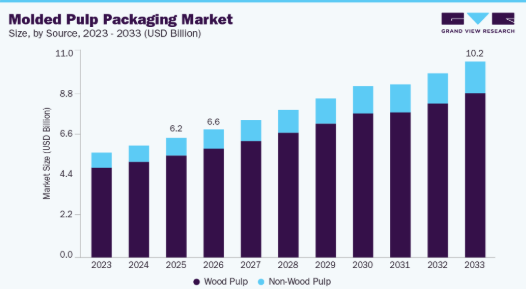 2025年には、木材パルプセグメントが売上高シェアの85.0%以上を占めました。これは、その豊富な供給量、コスト効率の良さ、そして様々な食品に合わせて厚さ、サイズ、形状をカスタマイズできる点によるものであり、これらが包装メーカーにとって人気の選択肢となっている理由でもあります。木材パルプ成形包装は、様々な最終用途産業で幅広く活用されています。例えば、輸送や保管中の食品を優れた保護性能で守ることができるため、食品・飲料業界で広く使用されています。