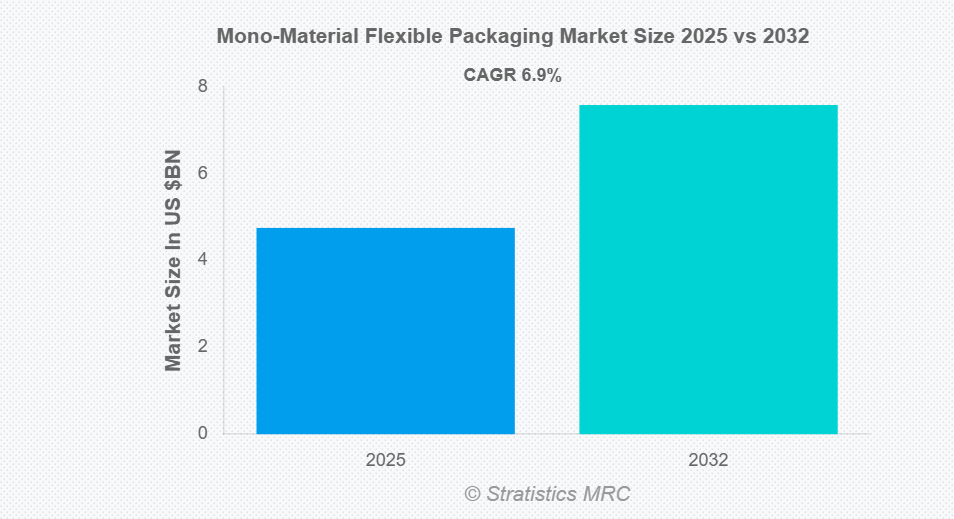 Stratistics MRCによると、世界の単一素材フレキシブル包装市場は2025年に47億5,000万ドル規模となり、予測期間中に年平均成長率(CAGR)6.9%で成長し、2032年までに75億8,000万ドルに達すると見込まれています。