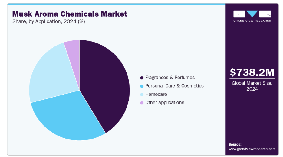 一方、天然系セグメントは市場シェアこそ小さいものの、消費者の嗜好がクリーンラベルやエコフレンドリーな製品へと傾くにつれ、存在感を増しています。主にアンブレット種子油やその他の植物由来の天然ムスクは、高級香水やハイエンド化粧品におけるプレミアム原料として位置付けられています。しかしながら、入手可能性の制限、高コスト、生産量の拡大が課題となり、洗剤や家庭用品などの大量用途への浸透は妨げられています。こうした制約があるにもかかわらず、ヨーロッパ、北米、アジアの高級美容市場における天然・持続可能な代替品への需要増加を背景に、予測期間中は同セグメントの成長が加速すると見込まれます。これにより、特に高級品や特殊用途において、合成セグメントの優位性を補完する戦略的ニッチ市場としてのムスクの位置付けが確立されるでしょう。