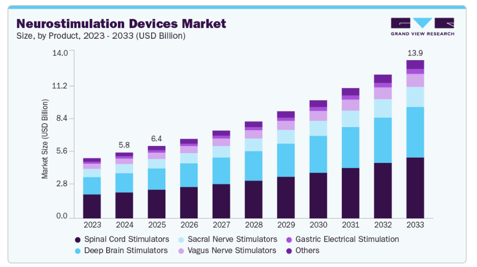 神経科学研究に対する政府資金の増加は、神経刺激装置市場の主要な推進要因です。これは先進的な神経刺激技術の開発を加速し、治療応用範囲を拡大するためです。政府が研究プログラム、臨床試験、革新イニシアチブに資金を配分することで、神経疾患の理解が深まり、神経刺激を用いた治療アプローチの画期的な進展が支援されます。