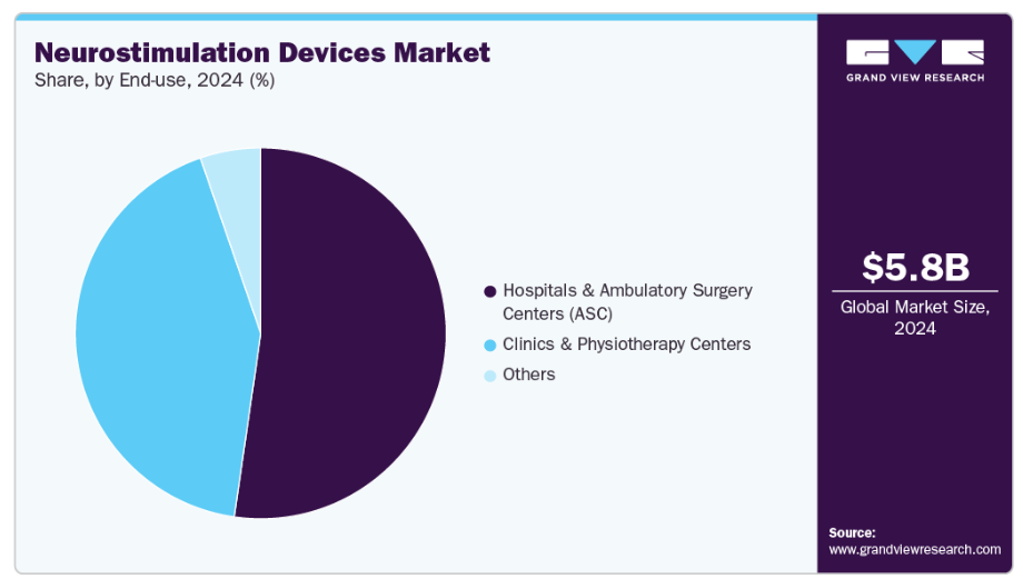 アプリケーション別では、2024年にパーキンソン病セグメントが最大のシェアを占めました。この成長は、疾患の高い有病率と先進的な神経刺激療法の導入増加に起因します。特に薬物療法だけでは不十分な場合、深部脳刺激(DBS)やその他の神経刺激アプローチは、パーキンソン病患者の運動症状管理における標準的な治療選択肢となっています。このセグメントの優位性は、精密な症状制御と患者の生活の質向上を実現するクローズドループシステムやBrainSense対応デバイスなどの技術革新によってさらに支えられています。加えて、パーキンソン病への認知度向上、研究投資の増加、専門的な神経医療へのアクセス拡大が、本疾患を対象とした神経刺激ソリューションの需要を後押ししています。