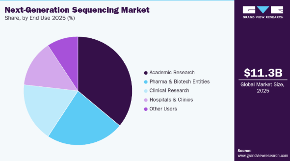 2025年には学術研究セグメントが36.05%の最大収益シェアで市場をリードした。大学や研究センターで実施される研究プロジェクトにおけるNGSソリューションの応用が、このセグメントの市場における最大のシェアを占めている。さらに、NGS分野の博士課程プロジェクト向けに提供される奨学金がNGS製品・サービスの需要を牽引し、予測期間中に収益性の高い成長をもたらすと予想される。NGSシーケンシングとデータ分析の実践的実施に関するワークショップを含むオンサイトバイオインフォマティクスコースの提供も、予測期間中に学術研究セグメントが生み出す収益を押し上げると予想される。
