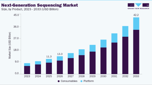 消耗品セグメントは2025年に最大の市場収益シェアを占め、2026年から2033年にかけて最速のCAGRで成長すると予測される。このセグメントの大きなシェアと急成長率は、主にNGSの商業・研究用途における消耗品の反復使用と高い需要に起因する。これらの消耗品にはサンプル調製キットやターゲットエンリッチメントキットが含まれる。NGS消耗品の採用は、多くの製薬会社や研究機関が複数の診断用途やがん研究にNGSを活用していることから増加している。例えば2022年6月、パーキンエルマーはワークフローの効率化と精度向上を目的とした3つのRUO NGSライブラリ調製キット(NEXTFLEX Small RNA-Seq Kit v4、NEXTFLEX Rapid XP V2 DNA-Seq Kit、PG-Seq Rapid Kit v2)を発売した。