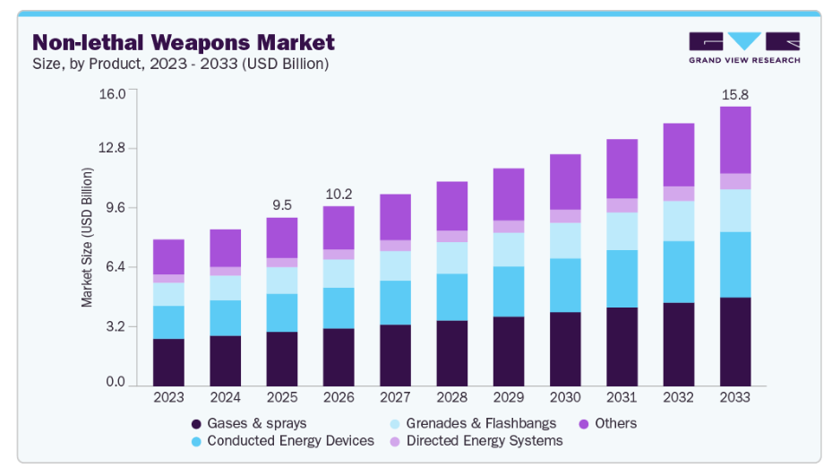 主な需要の要因としては、より害の少ない防衛手段の導入を目的とした、法執行機関や軍事組織における近代化の取り組みが挙げられます。指向性エネルギー兵器、音響装置、改良された化学刺激剤などの技術的進歩により、作戦効率が向上しています。テロ、国境紛争、反乱の脅威の高まりも、非致死性システムの調達を加速させています。民間警備の拡大や重要インフラの保護も、着実な導入を支えています。国際人権団体からの圧力により、各国政府は非致死性の群衆管理ソリューションの導入を迫られています。