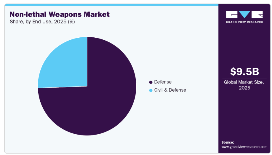 2025年、防衛セグメントは、軍事や準軍事組織による大規模な採用に牽引され、74.42%という最大の売上シェアを占めました。世界各国の政府は、平和維持活動や対反乱作戦における非致死能力を強化するため、暴動鎮圧用薬剤、フラッシュバン、音響威嚇装置、および非致死性弾薬を調達しています。防衛分野の優位性は、巨額の予算、国際的な安全保障任務、そして効果的な作戦統制を維持しつつ死傷者を最小限に抑えることを重視する人道法への遵守の必要性によって、さらに支えられています。
