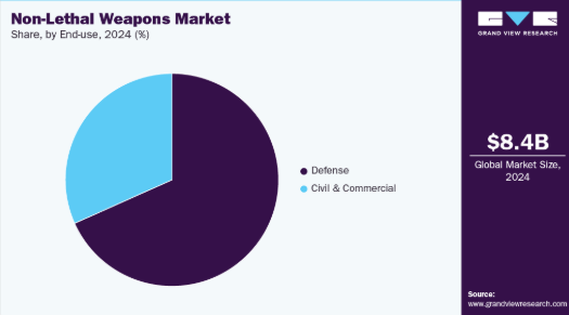防衛分野は2024年に非致死性兵器業界で最大の収益シェア(68.3%)を占め、軍や準軍事組織による大規模導入が牽引した。世界各国の政府は、平和維持活動や反乱鎮圧作戦における非致死能力を強化するため、暴動鎮圧剤、フラッシュバン、音響警告装置、低致死性弾薬を調達している。防衛分野の優位性は、巨額の予算、国際安全保障任務、そして効果的な作戦統制を維持しつつ死傷者最小化を重視する人道法の遵守必要性によってさらに支えられている。