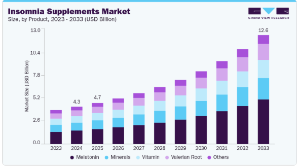 米国における不眠症サプリメント市場は急成長しており、睡眠健康への意識の高まりと自然療法・OTC療法への依存度増加が主要な成長要因となっている。消費者は処方睡眠薬のより安全な代替品として、メラトニン、マグネシウム、ハーブブレンドをますます選択している。成熟したサプリメント産業、強力なデジタル小売エコシステム、ストレス起因の不眠症増加により、同国は世界最大の不眠症サプリメント市場を形成している。