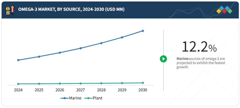 海洋由来のオメガ3は、体内で直接利用可能な必須脂肪酸であるEPAとDHAを高い濃度で含有しているため、生体利用率と効果が向上し、より人気が高く広く利用されています。さらに、海洋由来のものはタンパク質、ビタミン、ミネラルなどより包括的な栄養プロファイルを提供することが多く、栄養価をさらに高めています。