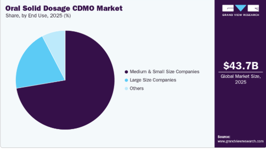 2024年には中小規模企業セグメントが世界市場を支配し、予測期間中に最も速い成長が見込まれる。このセグメントの成長は、中小規模企業が製造業務をCDMOやCMOにアウトソーシングするケースが増加していることに起因する。中小規模の製薬企業は、製剤開発、プロセス最適化、固形経口剤形の製造において限られたリソースと能力しか持たない。アウトソーシングにより、多額の先行投資なしにCDMOが提供する専門的知見、先進技術、最先端設備を利用可能となる。事業者の戦略的取り組み増加もセグメント成長の主要因である。2021年8月、Recro Pharma, Inc.(別名Societal CDMO)は経口固形製剤の受託開発・製造を手掛ける米国CDMO企業IRISYSを買収した。この買収により、同社は多様な顧客基盤と財務状況に対応する事業能力を拡大した。