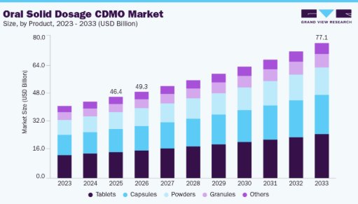 さらに、薬物送達技術の継続的な進歩、OSD開発拡大に向けた受託開発製造機関(CDMO)による投資増加、新規治療法への需要拡大により、現在市場には複数の固形製剤が流通しており、これら全てが市場成長をさらに促進している。