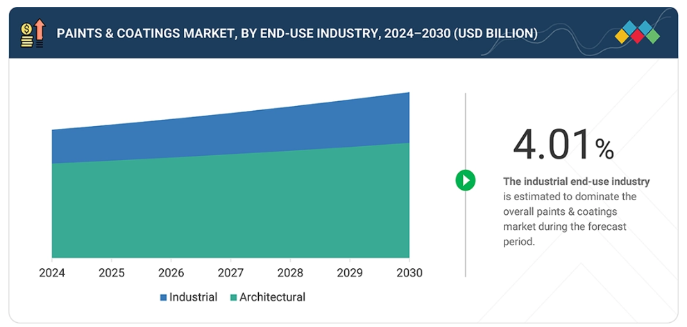 塗料・コーティング市場は、建設活動の増加、工業生産の成長、材料性能における継続的な革新に牽引され、予測期間中に着実な拡大が見込まれます。塗料とコーティング剤は、多様な基材に対して表面保護、耐久性、エステティクスを提供するように設計されています。建築、自動車、産業、保護用途からの需要増加に加え、低排出・持続可能な配合の採用を求める規制圧力により、市場成長が促進されています。技術進歩と、高性能かつエコフレンドリーなソリューションを求めるエンドユーザーの嗜好変化により、競争環境は絶えず変化しております。