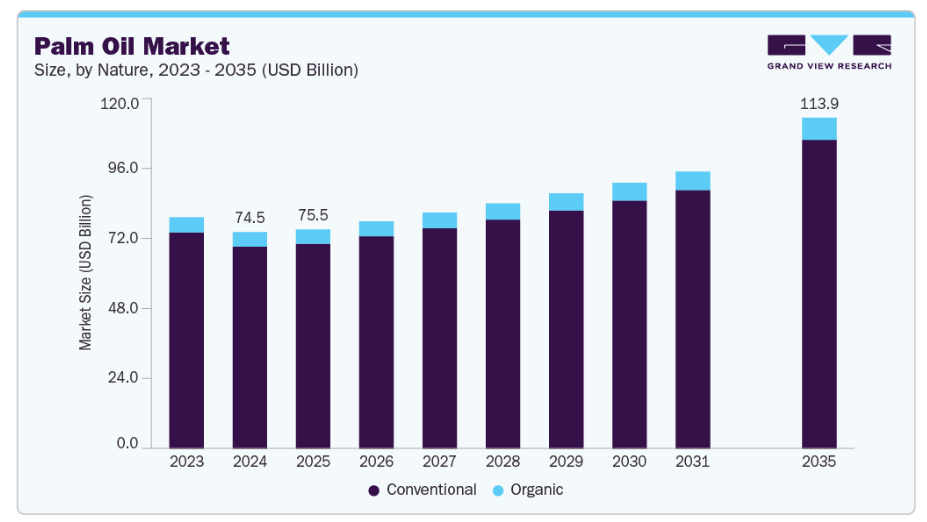 ■ 英語タイトル:Palm Oil Market Size, Share & Trends Analysis Report By Nature (Organic, Conventional), By Product (Crude Palm Oil, Palm Kernel Oil, RBD Palm Oil), By Application (Food & Beverage, Pharmaceuticals, Biofuel & Energy, Personal Care & Cosmetics), By Region, And Segment Forecasts, 2025 - 2035
