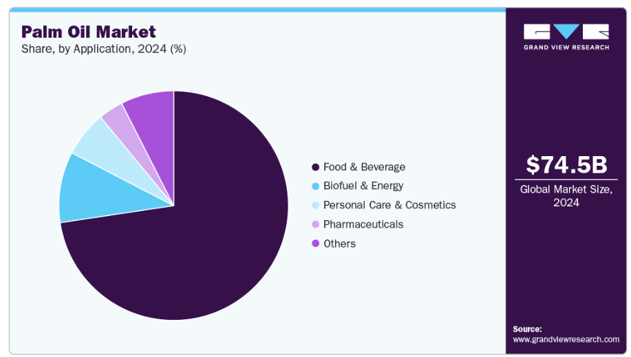 食品・飲料セクターは、食用油、ベーカリー製品、スナック、加工食品における広範な使用に支えられ、2024年には72.7%の収益シェアで市場を支配しました。パーム油の高温安定性と長期保存性は、世界中のメーカーにとって好ましい原料となっています。手頃な価格で多用途な食用油に対する消費者需要の高まりが、その主導的地位をさらに強化し続けています。