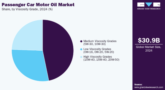 中粘度グレード(5W-30、10W-30)は、従来型および中級ガソリン車・ディーゼル車に広く適合するため、2024年に製品セグメントの売上高シェア46.8%を占め主導的地位を維持した。数十億台に及ぶこうした車両が走行しているため、アフターマーケット消費は一貫して高水準を維持している。この定着した車両ベースが、安定かつ高ボリュームの需要を支えている。