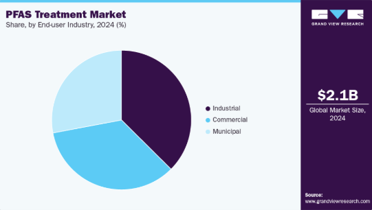 産業セグメントは2024年に37.5%という最大の収益シェアで世界のPFAS処理市場を支配しており、これは主に化学、繊維、電子機器、金属めっきなどの製造セクターにおけるPFAS化合物の広範な使用に起因する。これらの産業は、生産プロセスや廃水ストリームからのPFAS排出を軽減するよう、規制面および環境面での圧力が高まっている。企業の持続可能性への重視の高まりと、米国環境保護庁(EPA)の「PFAS戦略ロードマップ」やEUのREACH規制などの枠組みに基づくコンプライアンス要件の強化が相まって、先進的なオンサイト処理システムの導入が加速している。産業関係者は規制順守と環境リスク最小化のため、イオン交換、膜ろ過、高効率吸着剤などの技術への投資を拡大している。さらに、既存の産業用水管理インフラへのPFAS処理システム統合が進み、この分野での市場浸透を強力に後押ししている。