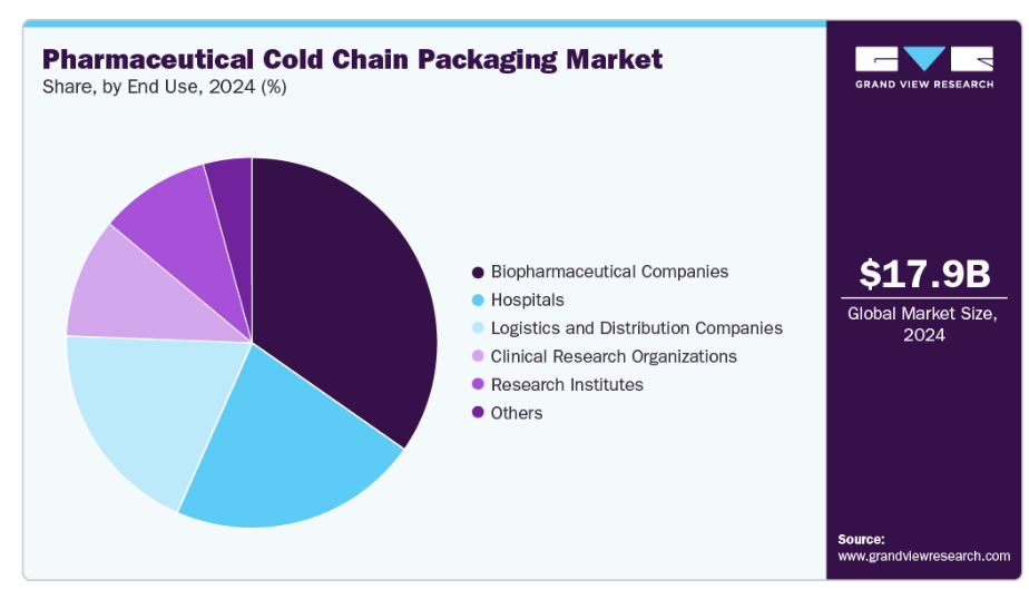 バイオ医薬品企業セグメントは、2024年に34.0%を超える最大の市場シェアを記録しました。バイオ医薬品企業は、厳格な温度管理を必要とする温度感受性医薬品、ワクチン、生物学的製剤、細胞・遺伝子治療、モノクローナル抗体などを扱うため、コールドチェーン包装の主要なユーザーです。製品の安定性範囲が狭い場合が多いため、これらの企業は断熱輸送容器、相変化材料、IoT対応追跡システムなどの先進的なコールドチェーン包装ソリューションに多額の投資を行っています。この需要は、従来の医薬品よりも温度に敏感な生物学的製剤や個別化医療の開発増加によって牽引されています。
