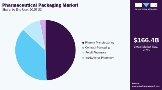 製薬製造は主要な最終用途セグメントであり、2025年には49.46%という最大のシェアを占め、2026年から2033年にかけて堅調な成長が見込まれています。これは、医薬品に対する需要の増加によるものです。世界保健機関(WHO)によると、2015年から2050年の間に、世界の人口に占める60歳以上の人口の割合は、12%から22%へとほぼ倍増する見込みです。高齢者は追加の医療支援を必要とするため、製薬製造活動が活発化します。その結果、医薬品包装への需要も高まると考えられます。