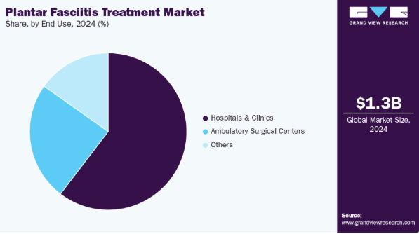 病院・クリニックセグメントは、統合された医療インフラ、専門医の専門知識、画像診断、保存的治療と介入的治療の両方を提供する能力により、2024年に60.4%という最大の市場収益シェアを占めました。患者が包括的な診断と先進治療へのアクセスを求める傾向から、病院・診療所は足底筋膜炎治療産業の中核を担っている。病院はより重症・慢性の症例を扱うことが多く、超音波装置、PRP調製システム、衝撃波治療装置などの機器を利用できる。整形外科、スポーツ医学、理学療法クリニックを含む診療所は、外来・非外科的治療の提供、迅速な予約、より費用対効果の高い選択肢により、病院ケアを補完する。2024年9月、米国フロリダ州ノースタンパのダイヤモンド・メディカル・クリニックは、スポーツ医学サービスの一環として体外衝撃波療法(ESWT)を導入し、足底筋膜炎治療を含む治療を提供している。